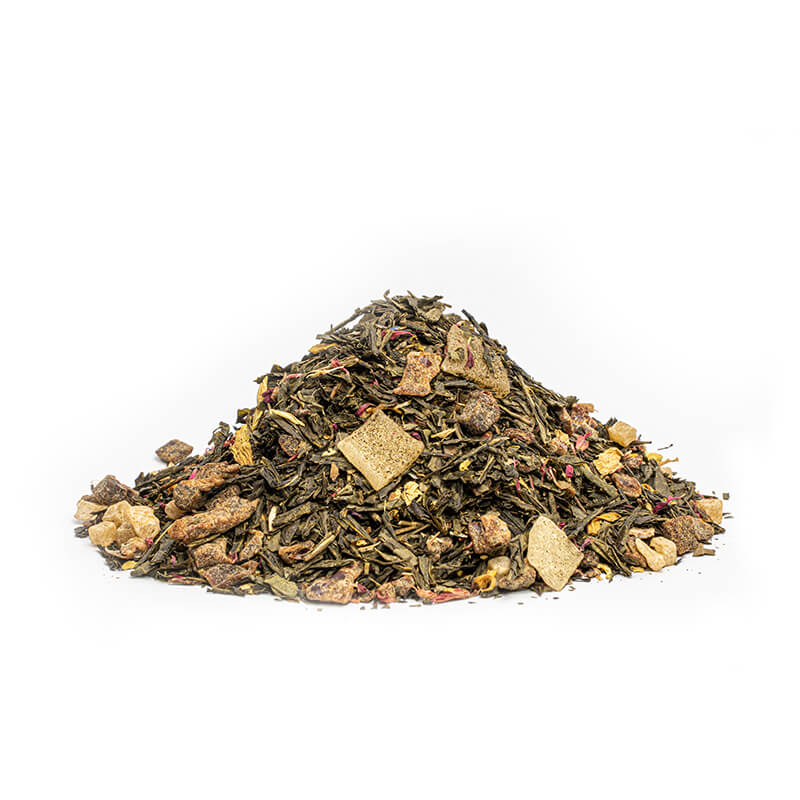 A green tea with acidic and fruity notes of pomegranate combined with refreshing pieces of aloe vera and delicate flowers, a perfect blend that will bring beauty and health to our body.
