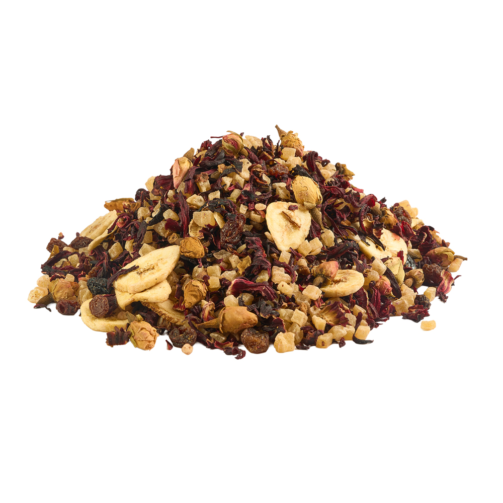 Este té combina la dulzura natural de los cubos de piña, sultanas y rodajas de banano, con el carácter floral del hibisco y los capullos de rosa, creando una infusión aromática, suave y llena de calidez.